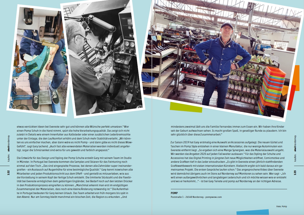 Entworfen auf Norderney und in Münster – von Hand gefertigt in Portugal. Das Reisemagazin "ahoi! norderney" gibt Einblicke in die Fertigung unserer Schuhkreationen. Die neue Ausgabe gibt es ab sofort kostenlos im Pomp®-Store Norderney – nur solange der Vorrat reicht. Kein Exemplar ergattert? Denn vollständigen Artikel findest Du nachfolgend: