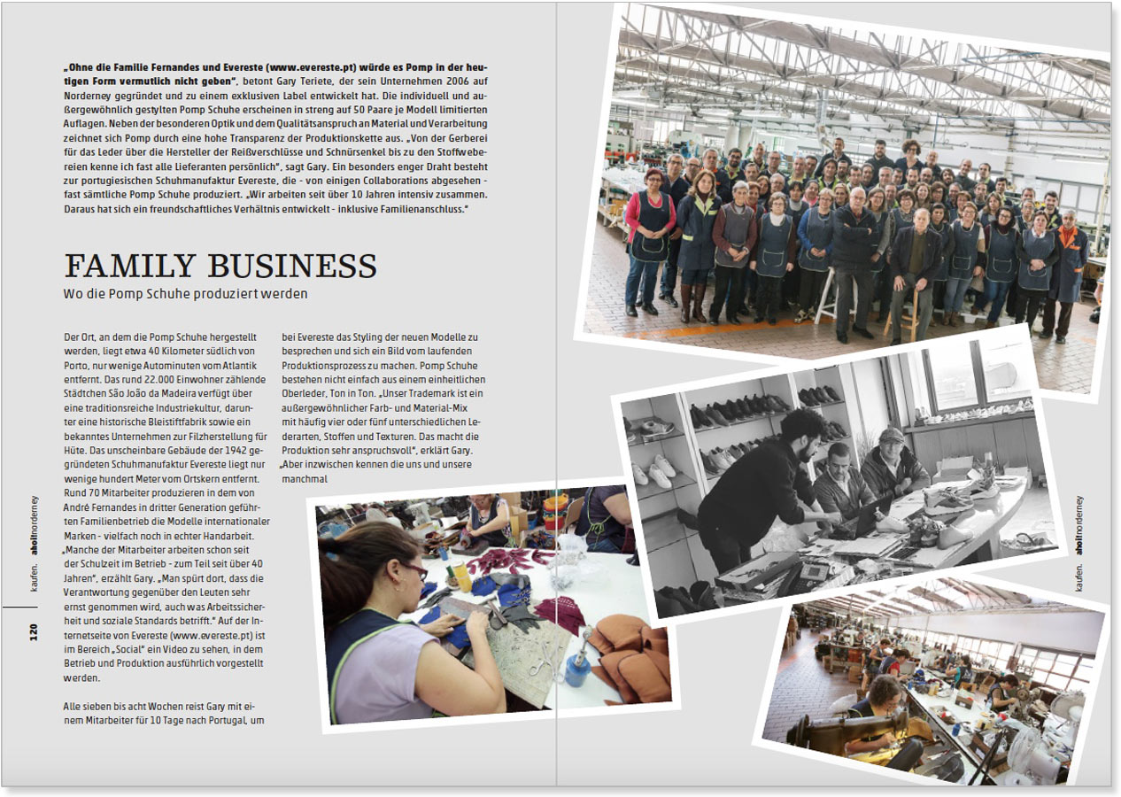 Der Ort, an dem die Pomp® Schuhe hergestellt werden, liegt etwa 40 Kilometer südlich von Porto, nur wenige Autominuten vom Atlantik entfernt. Das rund 22.000 Einwohner zählende Städtchen Sao Joao da Madeira verfügt über eine traditionsreiche Industriekultur, darunter eine historische Bleistiftfabrik sowie ein bekanntes Unternehmen zur Filzherstellung für Hüte. Das unscheinbare Gebäude der 1942 gegründeten Schuhmanufaktur Evereste liegt nur wenige hundert Meter vom Ortskern entfernt. Rund 70 Mitarbeiter produzieren in dem von André Fernandes in vierter Generation geführten Familienbetrieb die Modelle internationaler Marken – vielfach noch in echter Handarbeit. "Manche der Mitarbeiter arbeiten schon seit der Schulzeit im Betrieb – zum Teil seit über 40 Jahren", erzählt Gary. "Man spürt dort, dass die Verantwortung gegenüber den Leuten sehr ernst genommen wird, auch was Arbeitssicherheit und soziale Standards betrifft." Auf der Internetseite von Evereste ist im Bereich "Social" ein Video zu sehen, in dem Betrieb und Produktion ausführlich vorgestellt werden.