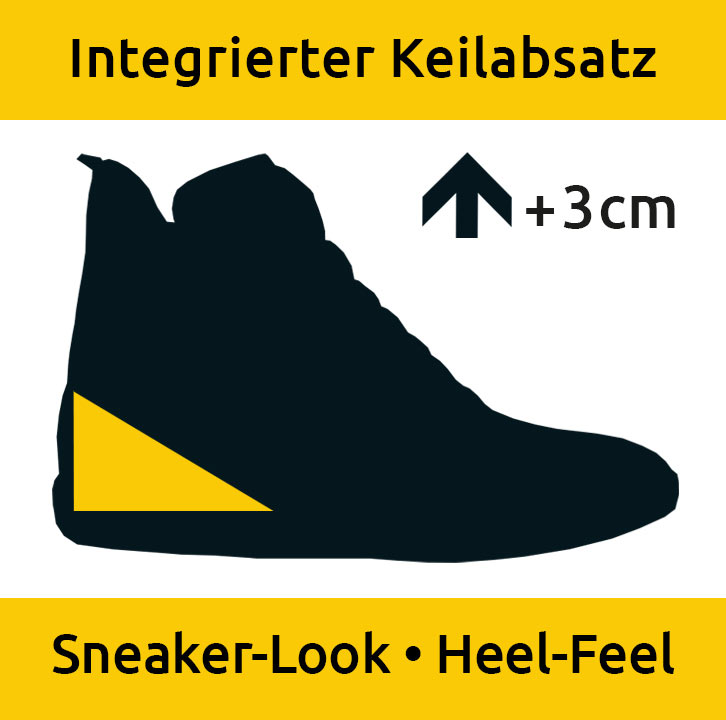 Klar ist, ein klassischer Absatz nimmt einem Sneaker sein charakteristisches Erscheinungsbild. Dieses ist nämlich entscheidend von der Sohlenform geprägt. Aus diesem Grund habe ich die neuen KIMCHI-Sneaker entworfen. Die Lösung: der integrierte Keilabsatz ist von außen unsichtbar. Trotz einer komfortablen Absatzhöhe von rund drei Zentimetern wirken die KIMCHI's wie reinrassige Hi-Top-Sneaker und unterstreichen Deinen sportlichen Style. Ist das nicht cool?