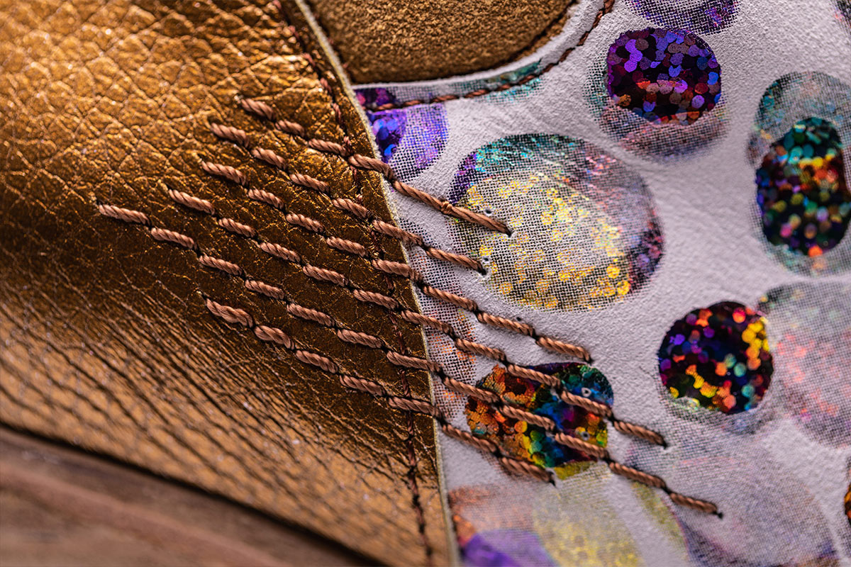 - Lederveredelung: Ziernähte, farbenfroher Print und Glanzeffekten